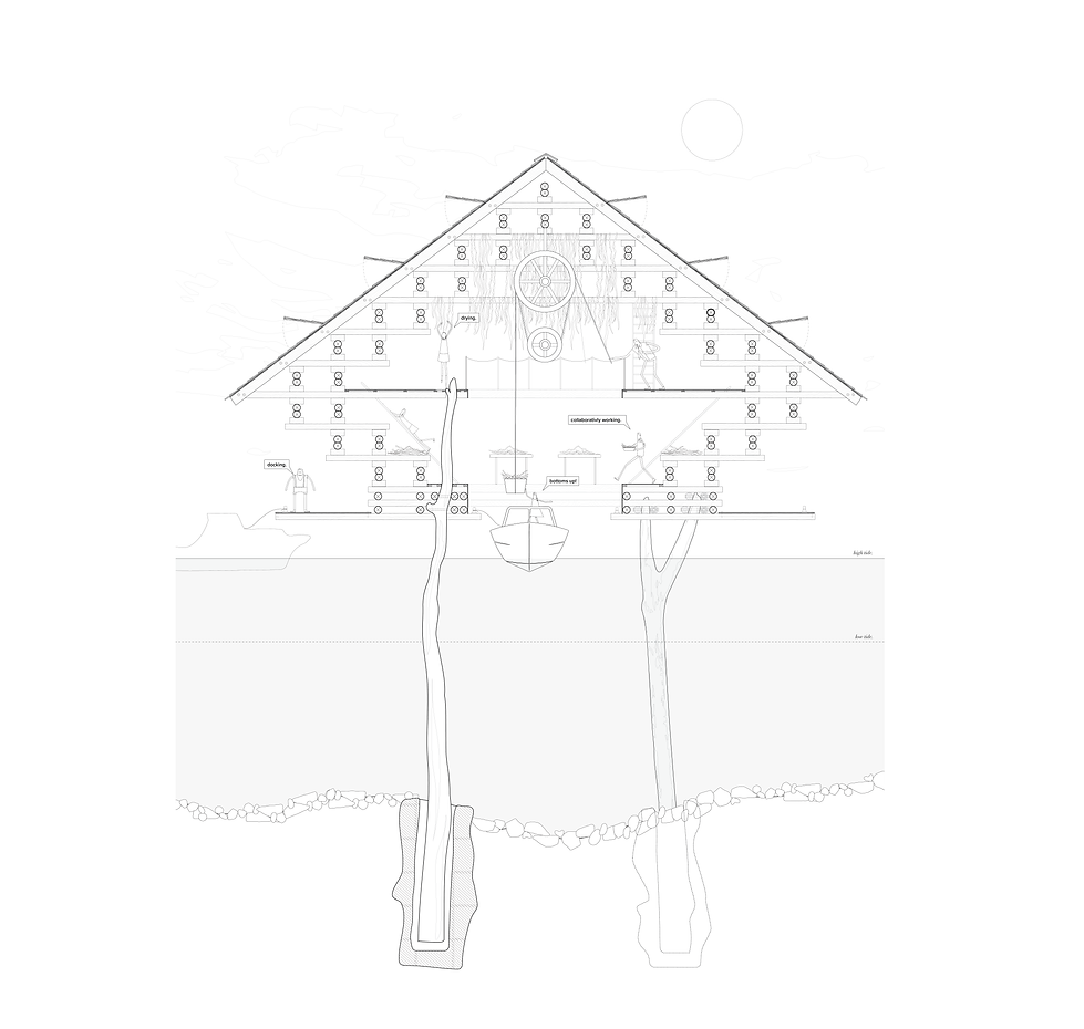 An over-water seaweed processing facility inspired by the concept of breaking down of the whole to hide it within its site.